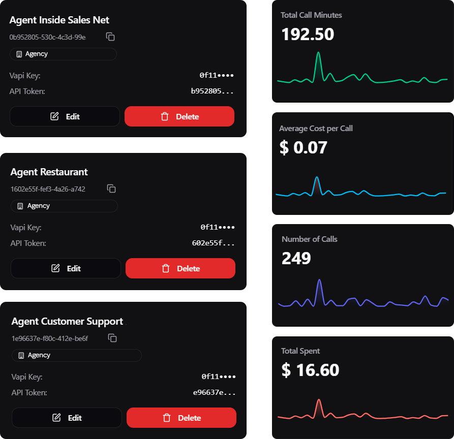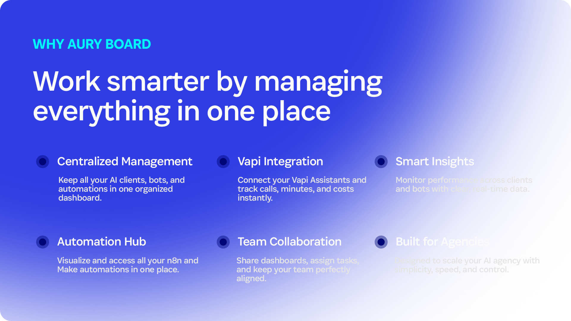 Connect your Vapi.ai Assistants and track calls, costs, and minutes in one place. AuryBoard centralizes your AI data so you can monitor performance and scale with precision.
