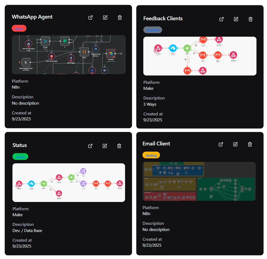 Connect your n8n and Make automations to visualize and access them instantly. AuryBoard keeps everything organized so you can manage workflows faster and smarter.